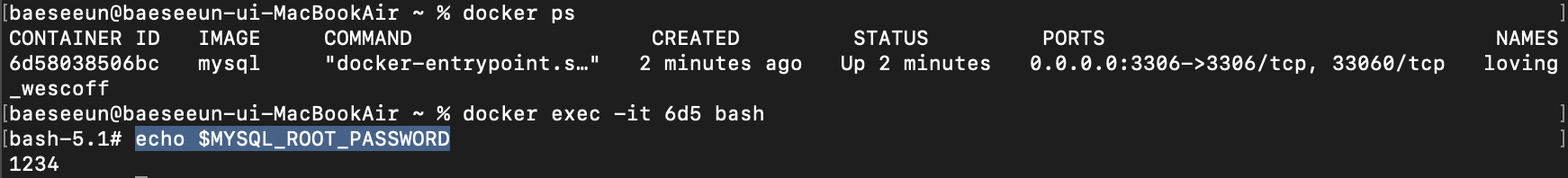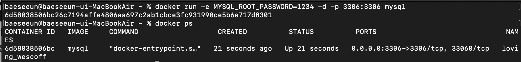 명령어 : docker run -e MYSQL_ROOT_PASSWORD=1234 -d -p 3306:3306 mysql