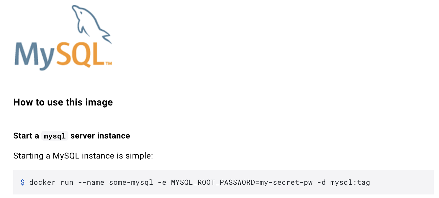 => 도커 허브에서 MySQL 을 검색하고 클릭해보면 사용법이 나와있다. 위의 그림은 MySQL 이미지 생성 후 비밀번호를 설정하는 방법에 대한 명령어이다.