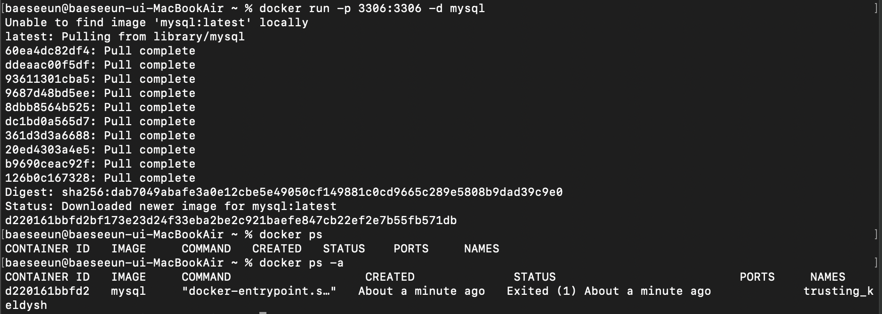 mysql을 다운받은 후 컨테이너를 조회해보면, mysql이 중지된 상태인 것을 확인할 수 있다.