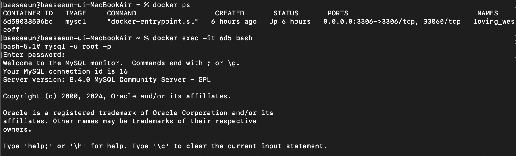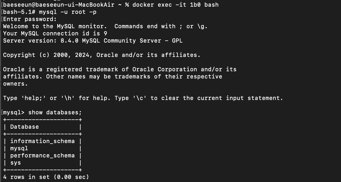 5. bash 로 mysql을 실행한뒤 데이터 베이스를 조회해보자.