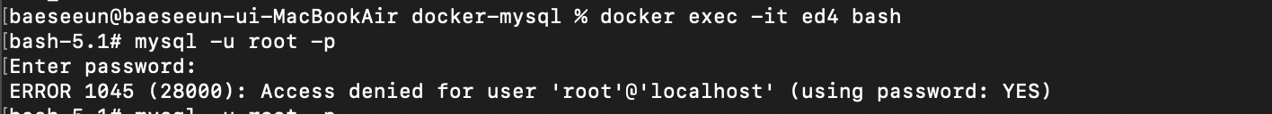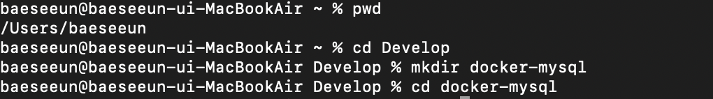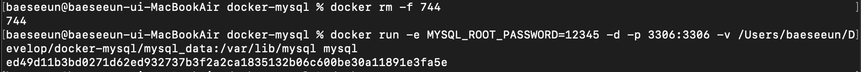 docker run -e MYSQL_ROOT_PASSWORD=1234 -d -p 3306:3306 -v /Users/baeseeun/Develop/docker-mysql/mysql_data:/val/lib/mysql mysql