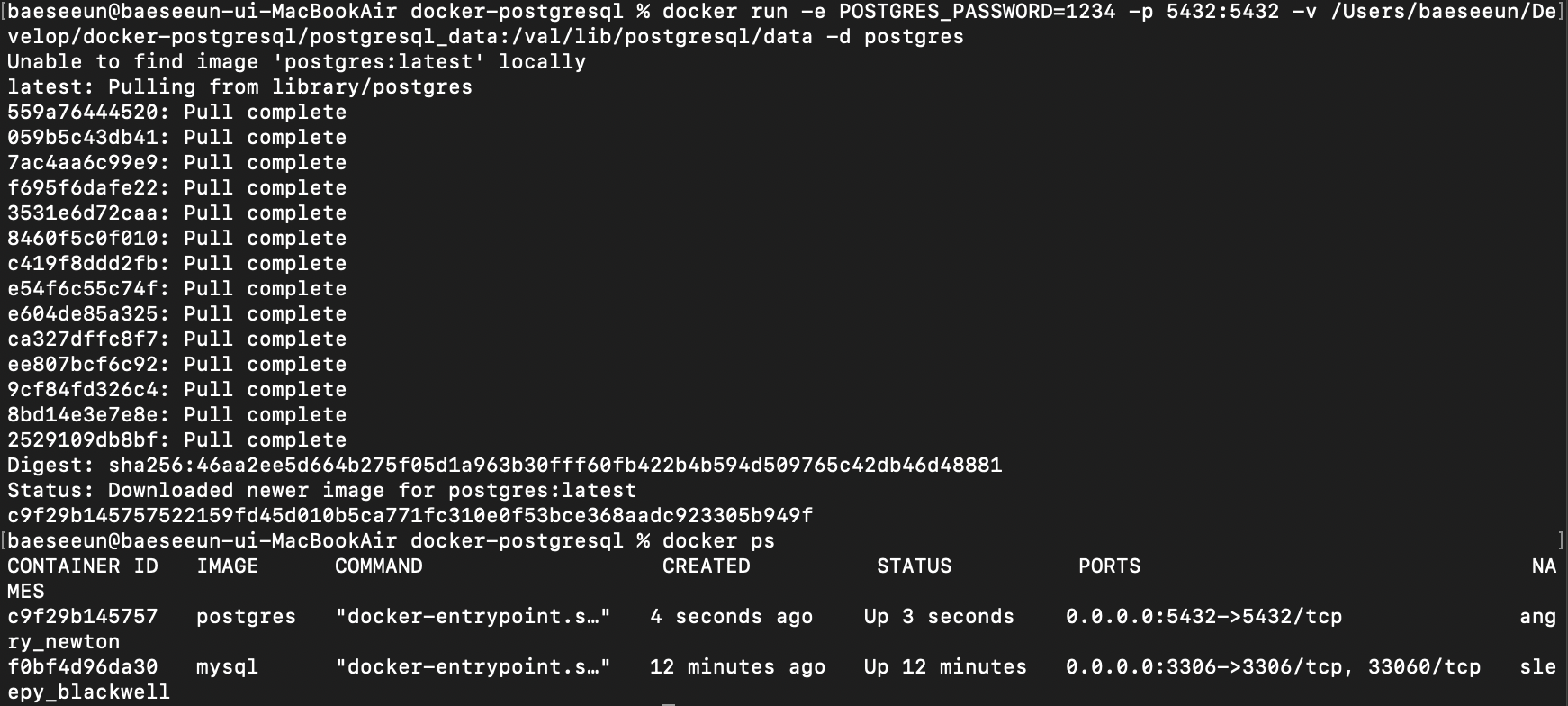 docker run -e POSTGRES_PASSWORD=1234 -p 5432:5432 -v /Users/baeseeun/Develop/docker-postgresql/postgresql_data:/val/lib/postgresql/data -d postgres