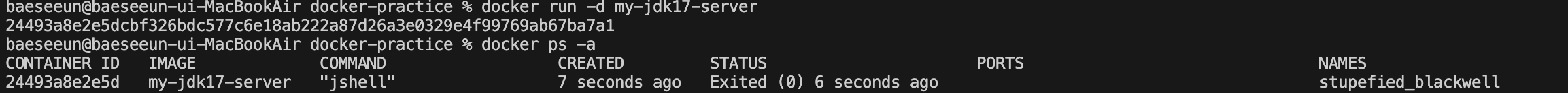 exec -it로는 확인이 불가능 하다. 컨테이너가 실행중이지 않기 떄문