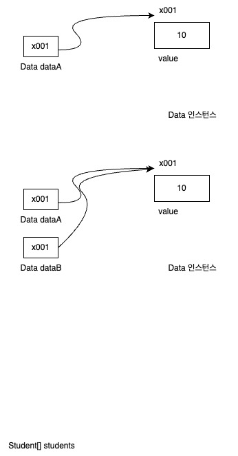 dataB는 dataA의 참조값을 복사해서 대입했으므로 같은 주소값을 가지고 있다. dataA, B 는 같은 인스턴스를 가리키고 있기 때문에 하나의 값을 변경해도 둘 다 적용되는 것이다. 즉, 두 변수는 같은 객체 인스턴스를 참조한다.