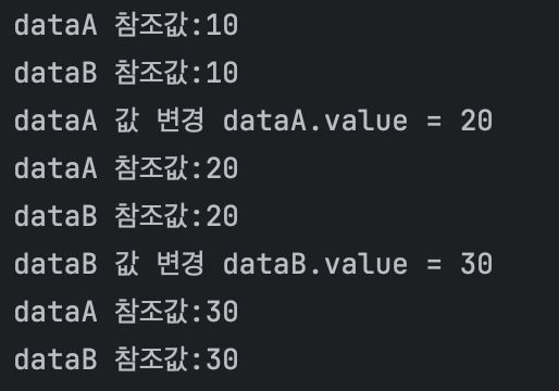 System.out.println("dataA 참조값:" + dataA.value); // 30