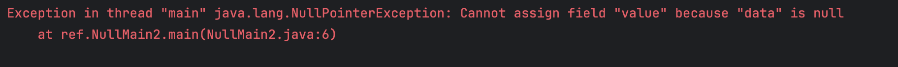 객체를 참조할 때 .(dot)을 사용한다. 이렇게 하면 참조값을 사용해서 해당 객체를 찾아갈 수 있다. 그런데 참조값이 null이라면 값이 없다는 뜻이므로, 찾아갈 수 있는 객체(인스턴스)가 없다. NullPointerException은 null에 .을 찍었을 때 발생한다.