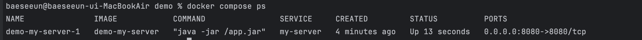 jar 파일이 바뀌면 새로운 스프링부트의 이미지로 빌드가 되어야 한다. 다시 빌드하고 compose를 띄우고 싶을 때 -- build를 써준다.