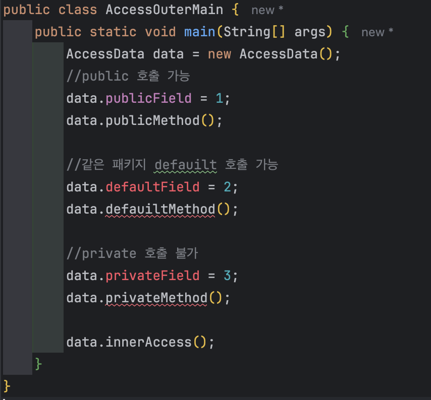 innerAccess() 메서드 자체는 AccessData에 포함되어 있다. 이 메서드는 자신의 private 필드와 메서드에 모두 접근할 수 있다.