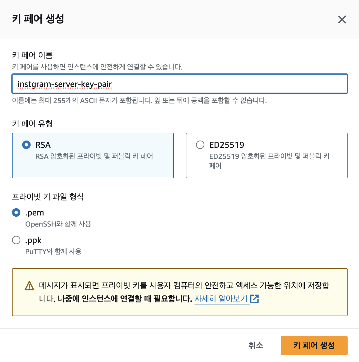 식별할 수 있는 키 페어 이름을 입력하고 키 페어 생성을 눌러보자. 이 때 파일이 생성되는데 이 파일은 유출해서는 안된다.