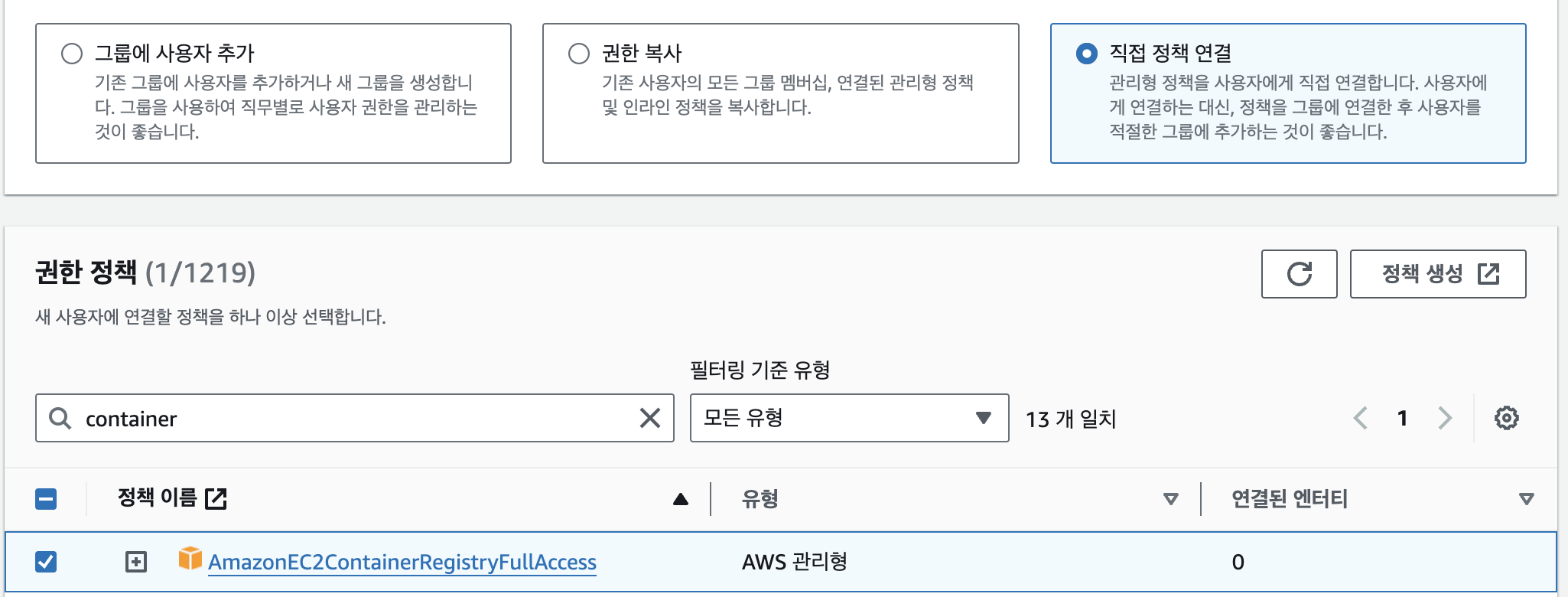 => container를 검색해서 RegistryFullAccess를 선택한 후 다음을 누른다.