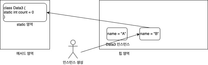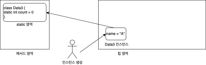 - Data3("A") 인스턴스를 생성하면 생성자가 호출된다. 생성자에는 count++ 코드가 있는데 여기서 count 변수는 정적 변수 이다. 정적변수는 메서드 영역에서 관리하기 때문에 메서드 영역에 있는 count 의 값이 증가하는 것이다.