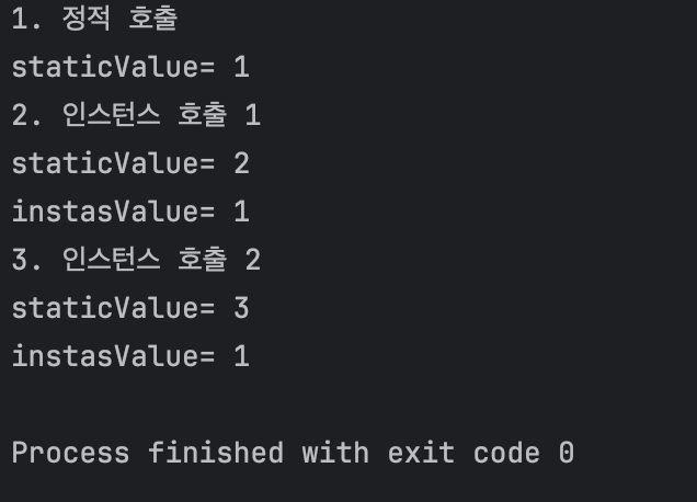 인스턴스 메서드: static이 붙이 않은 메서드는 인스턴스를 생성해야 호출할 수 있다. 이를 인스턴스 메서드라 한다.