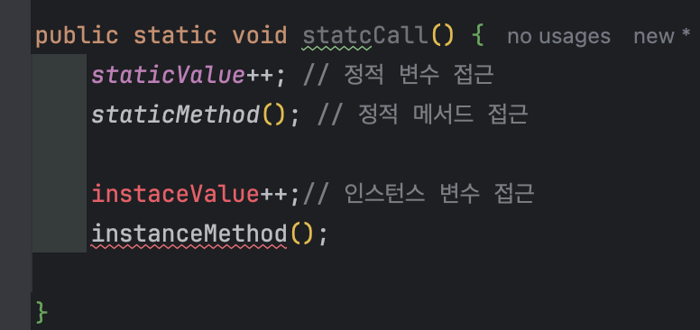 - 클래스 내부의 기능을 사용할 때, 정적 메서드는 static이 붙은 정적메서드나 정적 변수만 사용할 수 있다.
