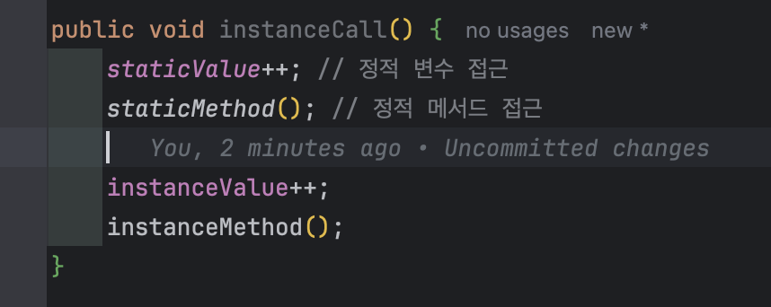 정적 메서드는 객체 생성없이 클래스에 있는 메서드를 바로 호출할 수 있다. 하지만 정적 메서드를 언제나 사용할 수 있는 건 아니다.