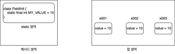 FieldInit.MY_VALUE 는 static 영역에 존재한다. 그리고 final 을 사용했기 때문에 값이 변하지 않는다.