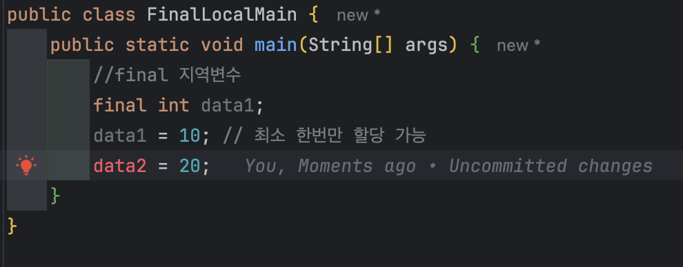 => final을 지역변수에 설정할 경우 최초 한번만 할당할 수 있다.