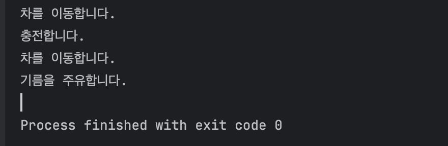 전기차(ElectricCar)와 가솔린차(GasCar)를 만들었다. 전기차는 이동, 충전 기능이 있고, 가솔린차는 이동, 주유 기능이 있다.