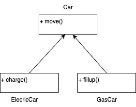 전기차와 가솔린차는 자동차의 구체적인 개념이다. 반대로 자동차는 전기차와 가솔린차를 포함하는 추상적인 개념이다. 전기차와 가솔린차를 살펴보면 공통적으로 이동(move) 기능이 있다. 이런 경우 상속 관계를 사용하는 것이 효과적이다 .