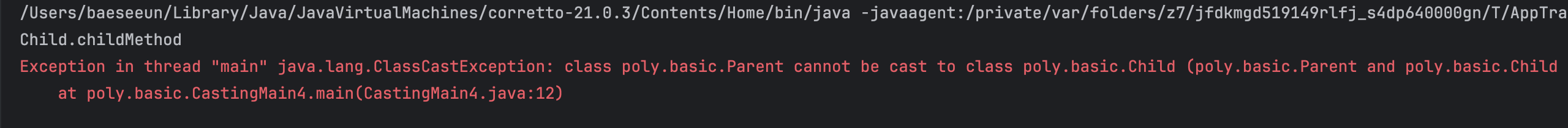 자바에서는 이렇게 사용할 수 없는 타입으로 캐스팅하는 경우에 ClassCastException 이라는 예외를 발생시킨다.