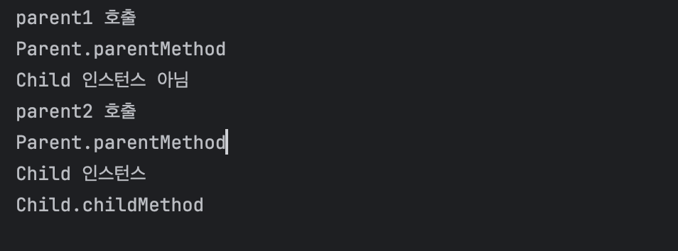 => parent1, 2 가 참조하는 인스턴스의 타입을 확인하려면 instanceof 키워드를 사용하면 된다.