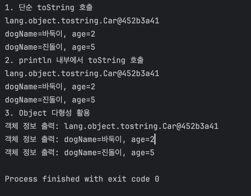 결과값이 같은 이유는 System.out.println() 메서드가 내부에서 toString() 을 호출하기 때문이다.