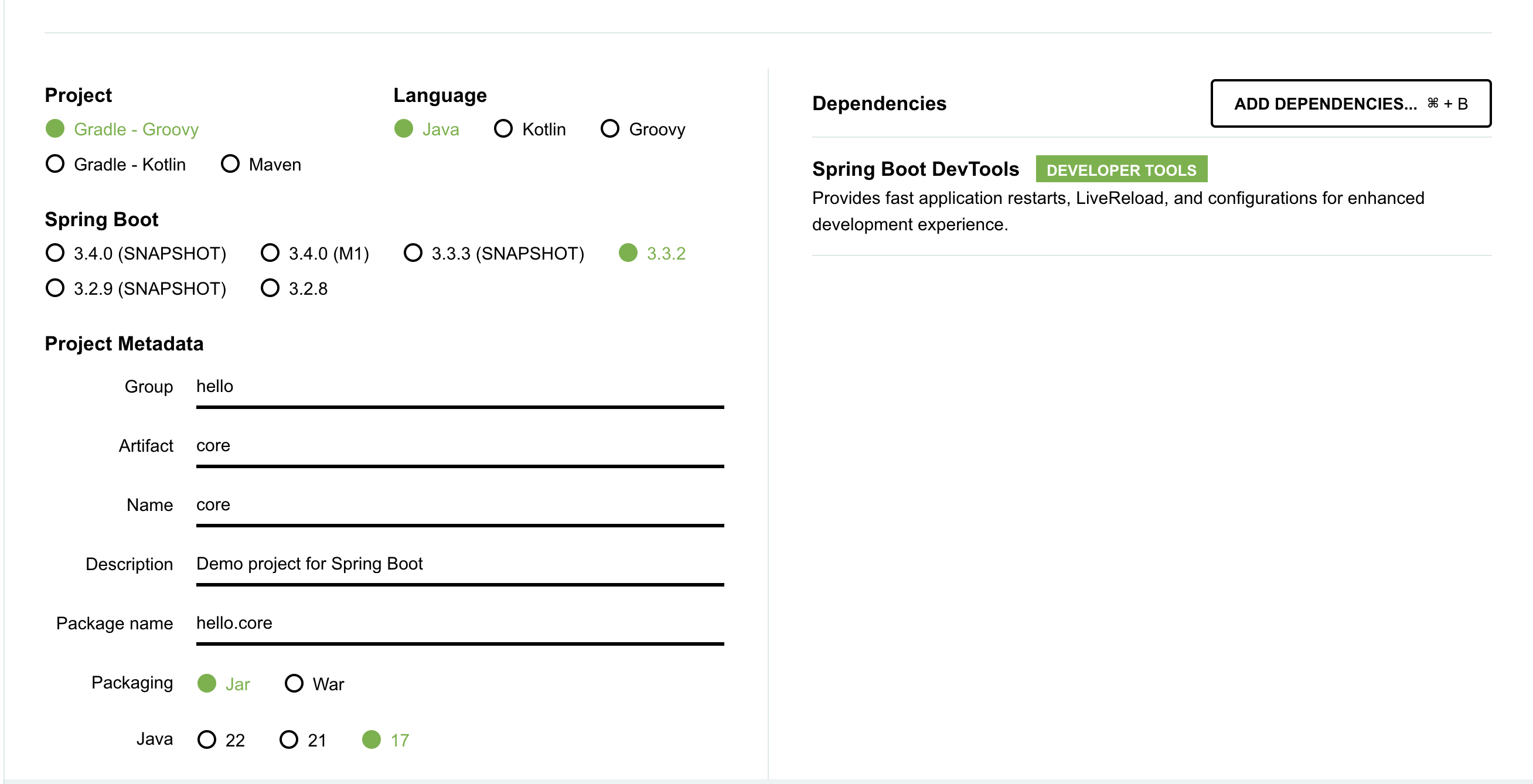 Dependencies 에는 dev tools 만 선택했다. 가장 기본적인 셋팅으로 프로젝트를 진행해보자.