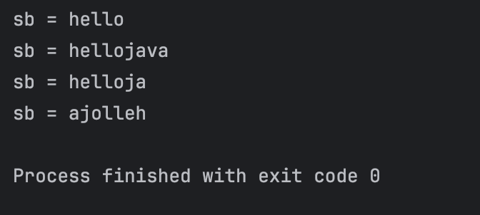 - StringBuilder는 가변이다. 하나의 StringBuilder 객체 안에서 문자열을 추가, 삭제, 수정할 수 있으며, 이 때마다 새로운 객체를 생성하지 않는다. 이로 인해 메모리 사용을 줄이고 성능을 향상시킬 수 있다.