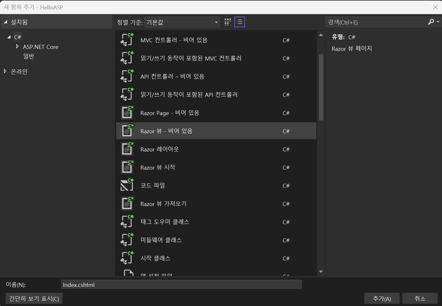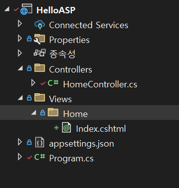 index.cshtml을 Home 폴더를 만들이 이 하위에 위치시킨다.