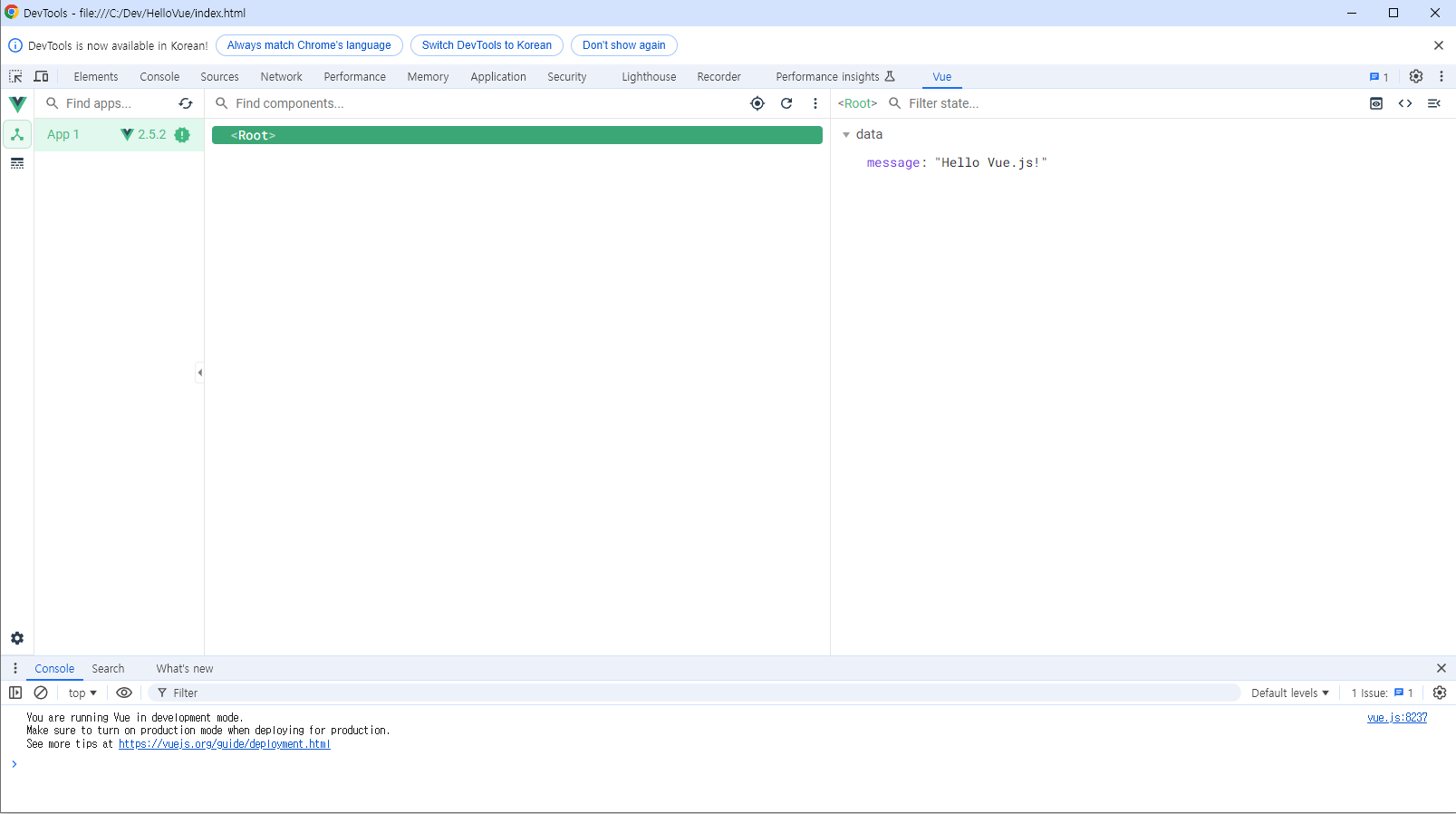 - Vue 인스턴스의 data에 정의된 message 값이 HTML의 {{message}} 부분에 자동으로 반영되어 'Hello Vue.js!'가 화면에 출력됩니다.