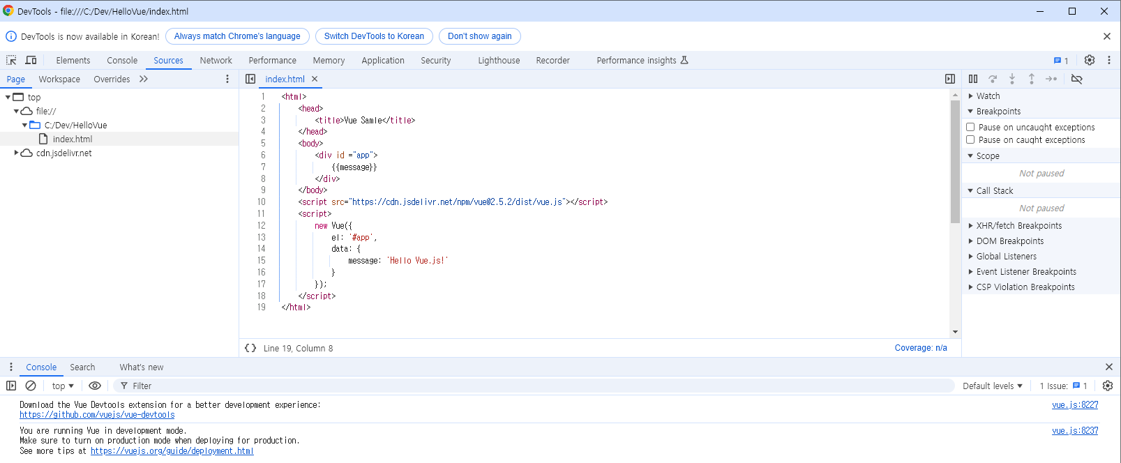 - Vue.js는 {{message}} 템플릿을 인식하고, 해당 위치에 message 데이터의 값을 출력합니다.