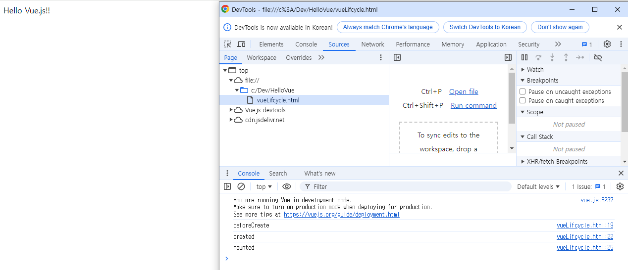 이 코드에서는 인스턴스의 각 라이프사이클 훅이 호출될 때마다 콘솔에 로그가 출력된다.. 예를 들어, 인스턴스가 생성되면 created가 호출되고, DOM에 연결되면 mounted가 호출된다.updated의 경우 인스턴스에서 데이터 변경이 일어나 화면이 다시 그려지는 경우 호출되므로 로그에 나오지 않았다.