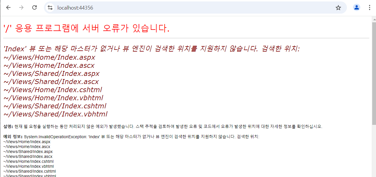 이 메시지는 MVC가 Views 폴더에서 Index라는 이름의 파일을 찾으려고 시도했지만, 파일이 없어서 발생한 것이다.