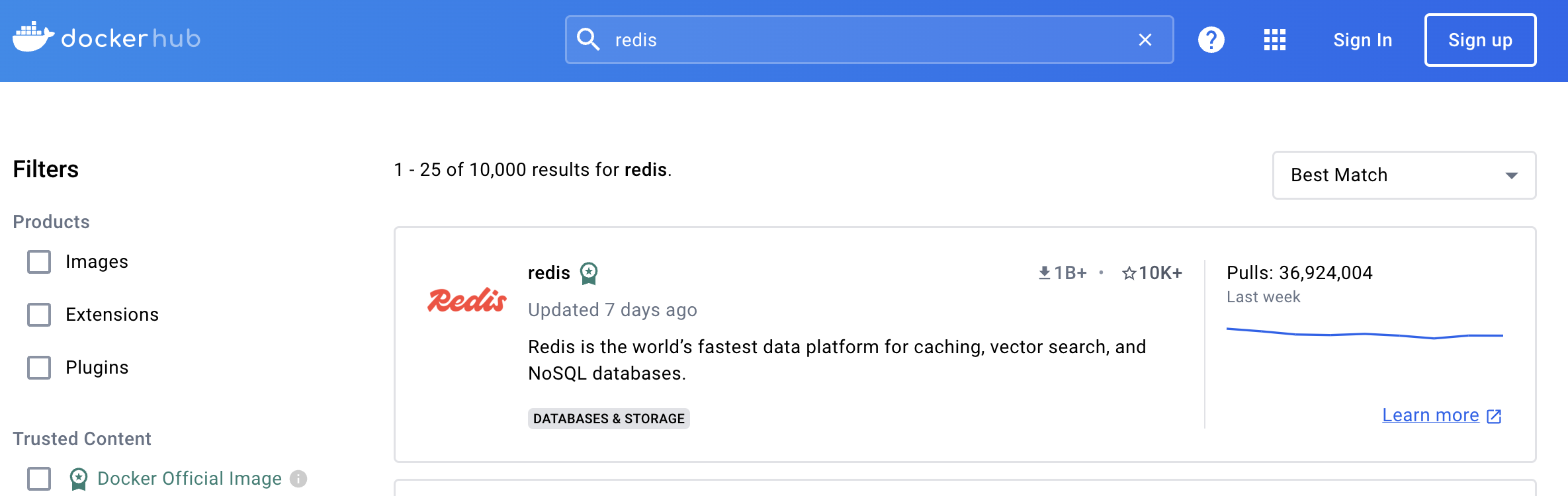 1. Docker hub 에 접속해서 Redis 이미지가 있는지 확인해본다.